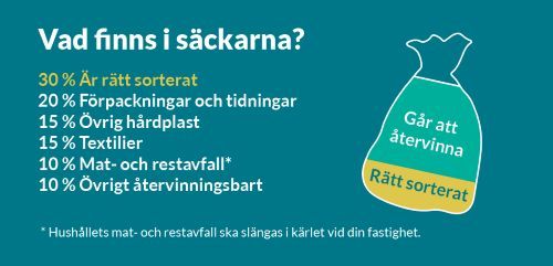 Plockanalyser visar att bara 30 procent av innehållet i de blandade säckar som slängs på återvinningscentralen är rätt sorterat. Resterande 70 procent är material som kan återvinnas istället för att eldas upp.