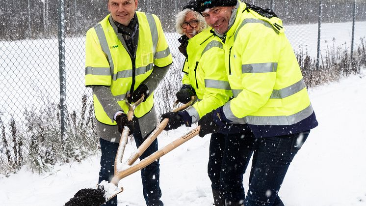 Idag togs det första spadtaget för den nya produktionsanläggningen som ska göra biokol av nordvästskåningarnas trädgårdsavfall. Ulf Molén, vd Nordvästra Skånes Renhållnings AB, tillsammans med styrelseordförande Eva Holm och Peter Danielsson, kommunstyrelsens ordförande i Helsingborg, planterade symboliskt en pinnek i en jordblandning med biokol. Ett träd som därmed får de bästa förutsättningarna att leva många hundratals år.