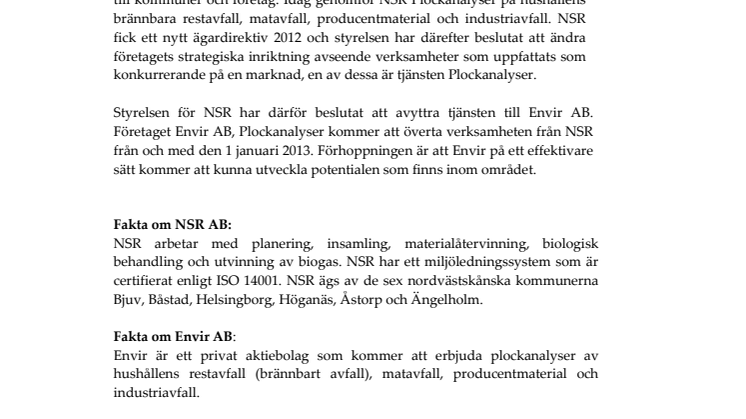 Styrelsen för NSR har därför beslutat att avyttra tjänsten till Envir AB. Företaget Envir AB, Plockanalyser kommer att överta verksamheten från NSR från och med den 1 januari 2013. Förhoppningen är att Envir på ett effektivare sätt kommer att kunna utveckla potentialen som finns inom området.