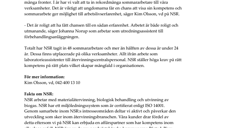 Totalt har NSR tagit in 48 sommararbetare och mer än hälften av dessa är under 24 år. Dessa finns utplacerade på olika verksamheter. Allt ifrån arbete som laboratorieassistenter till återvinningscentralspersonal. NSR ställer höga krav på rätt kompetens på rätt plats vilket skapar mångfald i organisationen.