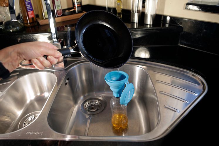 Fett och olja ska inte sköljas ut i diskhon. Häll istället gammal matolja och liknande i en plastflaska med kork och lägg den sedan i restavfallet.