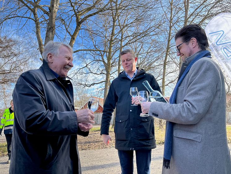 Ilmar Reepalu Sydvatten, Jonas Jacobsson Gjörtler NSVA, Johan Olsson Swanstein Båstads kommun, skålar i Sydvatten-vatten från tryckstegringsstationen i Torekov.