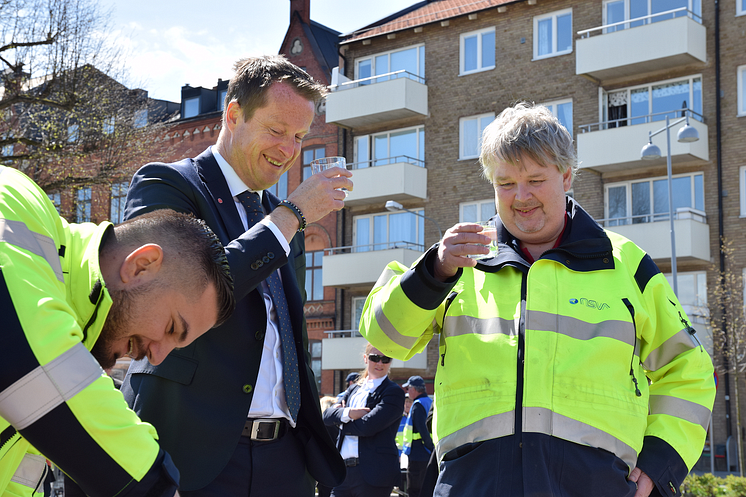 Krisberedskapsveckan, NSVA visar nödvattentankar, inrikesminister Anders Ygeman kommer på besök och dricker nödvatten. Säkerhetschef Anders Mårtensson, NSVA, och Dejan Tucakov, VA-ingenjör, NSVA.