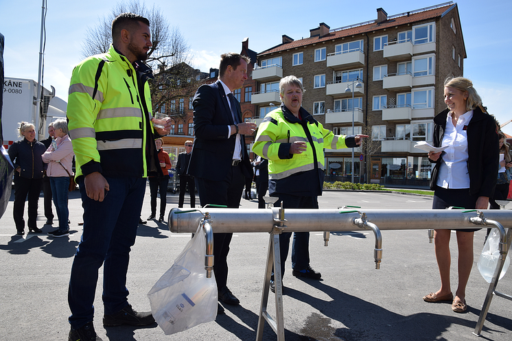 Krisberedskapsveckan, NSVA visar nödvattentankar, inrikesminister Anders Ygeman kommer på besök och dricker nödvatten. Säkerhetschef Anders Mårtensson, NSVA, och Dejan Tucakov, VA-ingenjör, NSVA.