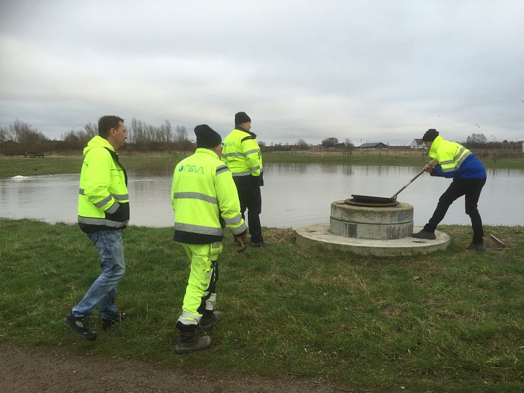 Kontroll av utgående vattenflöde i dagvattendammen i Rydebäck.