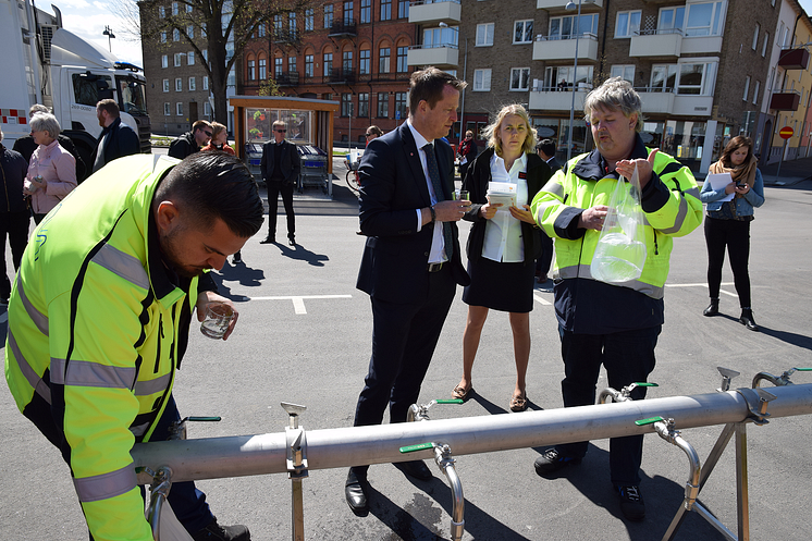 Inrikesminister Anders Ygeman var en av besökarna när Krisberedskapsveckan uppmärksammades i Landskrona. Här visar NSVAs säkerhetschef Anders Mårtensson hur man kan hämta nödvatten med hjälp av plastpåsar.