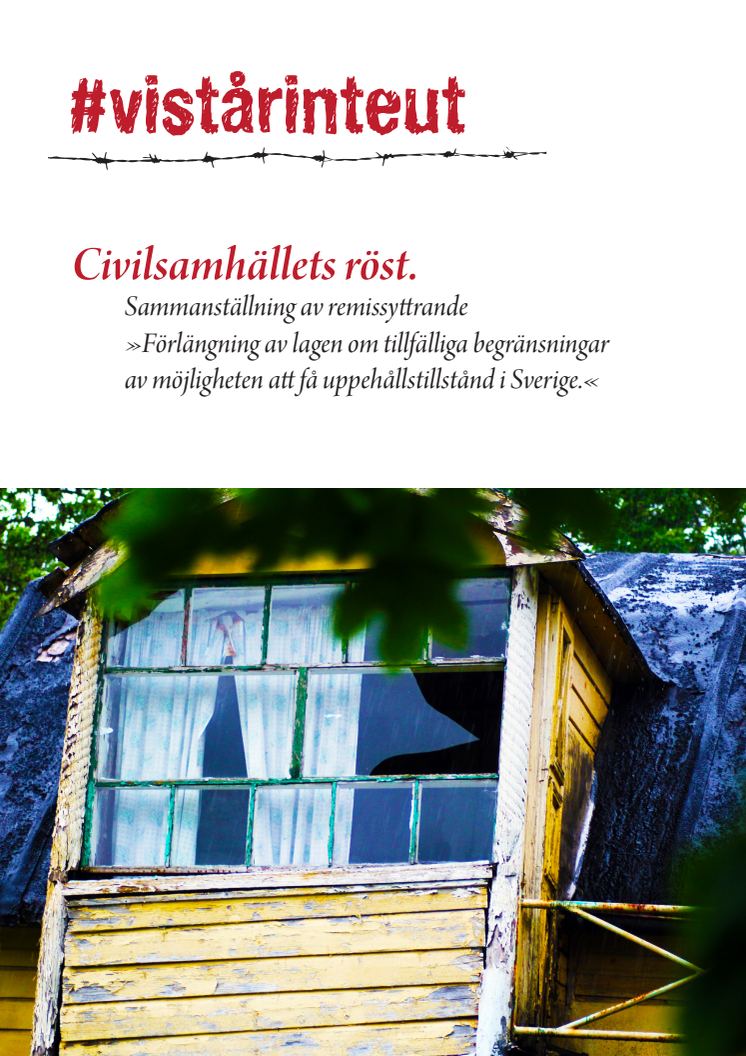 Rapporten "Civilsamhällets röst" är en tematisk sammanställning av de 62 remissyttranden yrkes- och volontärnätverket #vistårinteut skickade in angående förlängning av den tillfälliga begränsningslagen. Rapporten är sammanställd, författad och redigerad av Helena Mäki, Elisabet Rundqvist och Sara Edvardson Ehrnborg. Grafisk design: Kirsti Haugsand Wennerholm