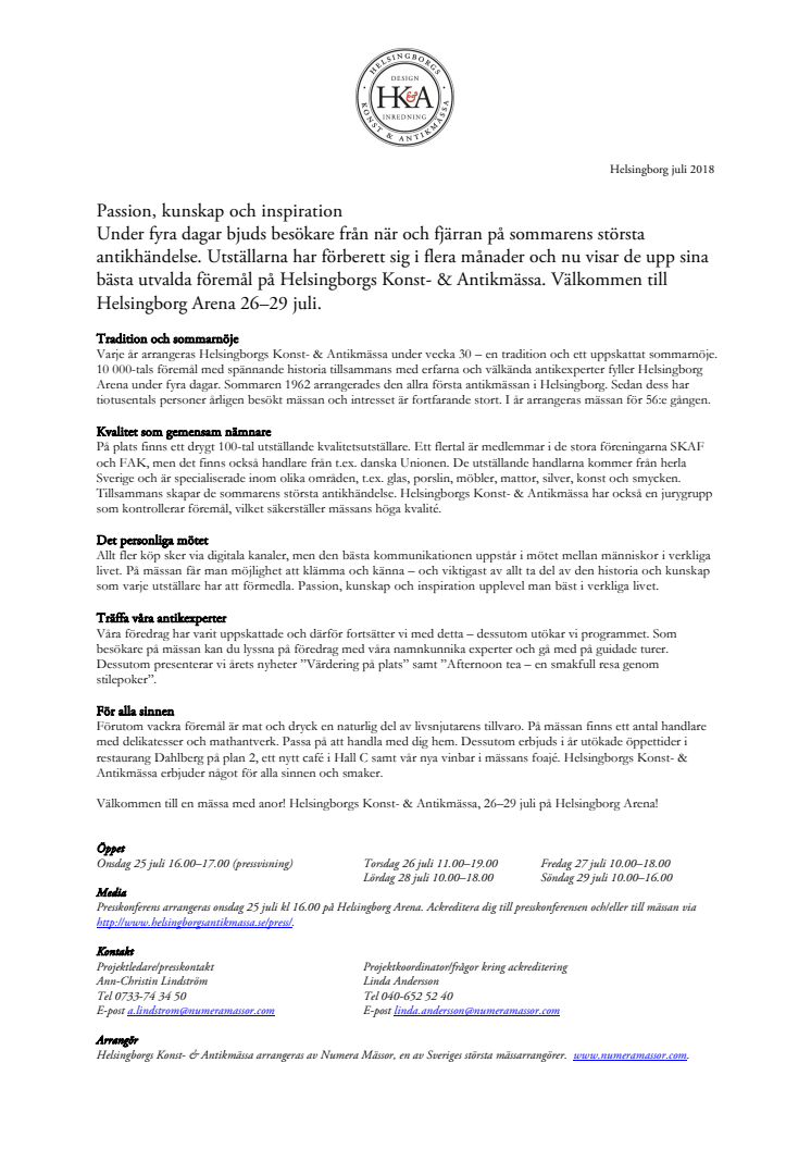 Under fyra dagar bjuds besökare från när och fjärran på sommarens största antikhändelse. Utställarna har förberett sig i flera månader och nu visar de upp sina bästa utvalda föremål på Helsingborgs Konst- & Antikmässa. Välkommen till Helsingborg Arena 26-29 juli.