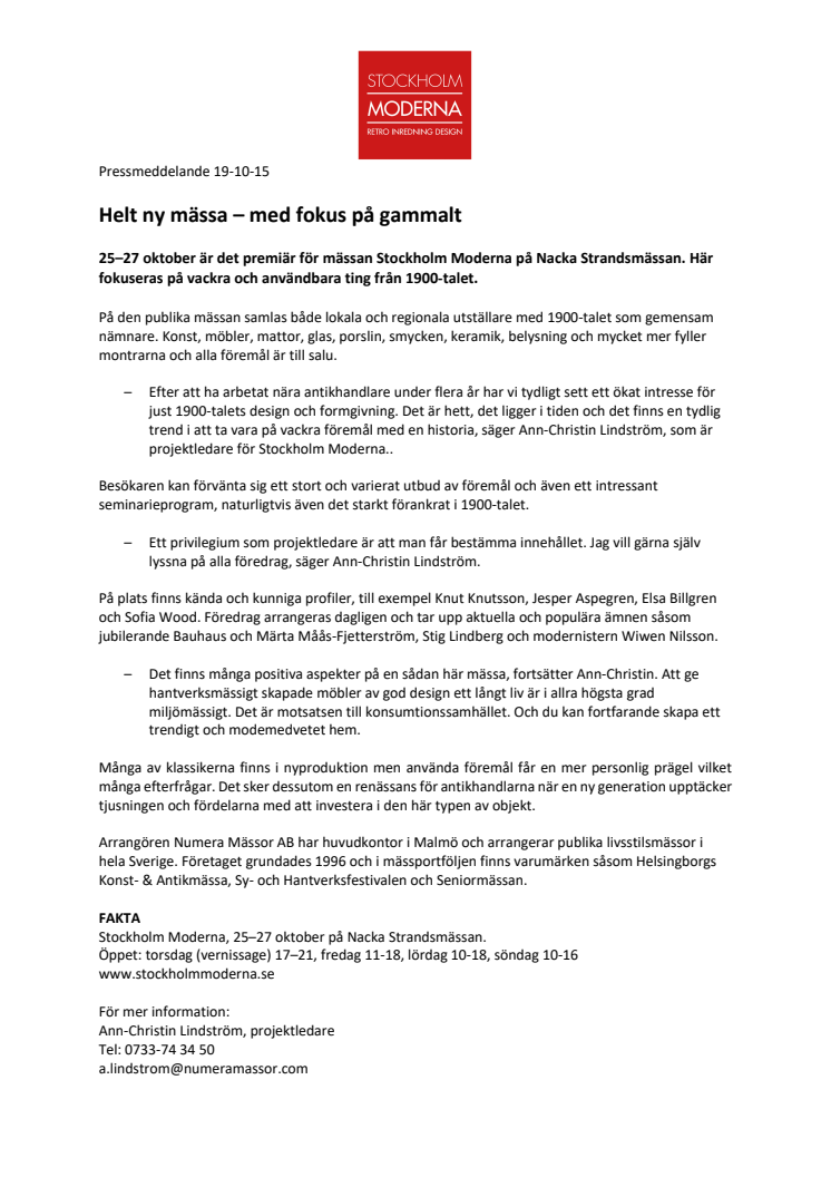 Premiär för Stockholm Moderna! 1900-talets fantastiska formgivning står i fokus när kvalitetshandlare med möbler, mattor, konst, skulptur, design, silver, smycken, glas och porslin ställer ut sina föremål. Besök oss på Stockholm Moderna, 25–27 oktober 2019, Nacka Strandsmässan. Välkommen!