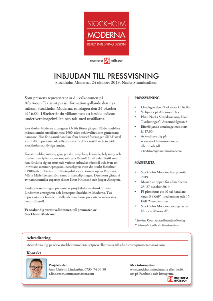 INBJUDAN TILL PRESSVISNING Stockholm Moderna, 24 oktober 2019, Nacka Strandsmässan