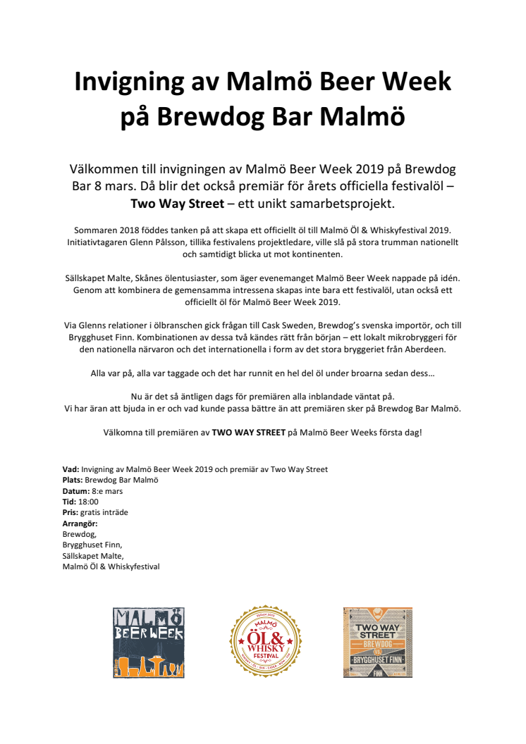 Välkommen till invigningen av Malmö Beer Week 2019 på BrewDog Bar 8 mars. Då blir det också premiär för årets officiella festivalöl – Two Way Street – ett unikt samarbetsprojekt.