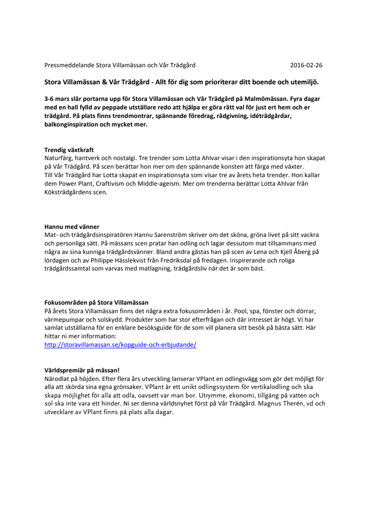 3-6 mars slår portarna upp för Stora Villamässan och Vår Trädgård på Malmömässan. Fyra dagar med en hall fylld av peppade utställare redo att hjälpa er göra rätt val för just ert hem och er trädgård. På plats finns trendmontrar, spännande föredrag, rådgivning, idéträdgårdar, balkonginspiration och mycket mer.