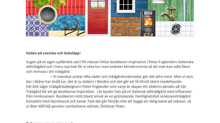 Sugen på en egen sydländsk oas? På mässan hittar besökaren inspiration i Peter Englanders italienska idéträdgård och i hans nya bok får vi veta hur man knäcker klimatzonerna så att man kan odla fikon och mimosa i din trädgård.
