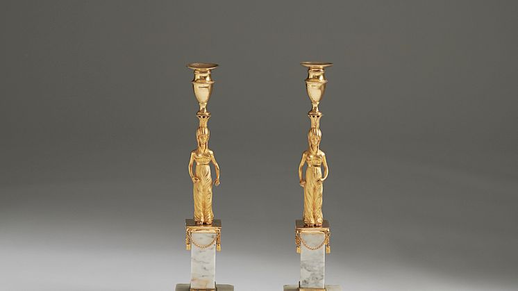 – Det här är ett par högklassiga gustavianska 1700-talsljusstakar i en mycket ovanlig modell. Den är så pass ovanlig att man mycket väl kan tänka sig att det handlar om ett beställningsarbete. Förgyllningen är lagd i så många lager att den efter mer än tvåhundra år fortfarande är lika glänsande. Den kommer att klara sig i hundra år till! Skulpturen som håller ett veteax i ena handen är troligen en bild av Ceres, växtlighetens gudinna i romersk mytologi. Vanligtvis framställdes de skulpturala inslagen mer formmässigt strikt, men här finns en livlighet som jag inte har sett tidigare. Den höga kvalitén och det skickliga utförandet tyder på att upphovsmannen kan vara gelbgjutaren och ciselören Fredrik Rung eller någon i hans krets. Rung, som var verksam från sent 1700-tal och några decennier in på 1800-talet, utförde högklassiga bronsarbeten för slott och herresäten. Hans dekorer förgyller många kungliga porfyrurnor.