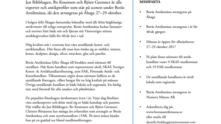 Jan Ribbhagen, Bo Knutsson och Björn Gremner är alla experter och antikprofiler som står på scenen under Borås Antikmässa, då den arrangeras på Åhaga 27–29 oktober.