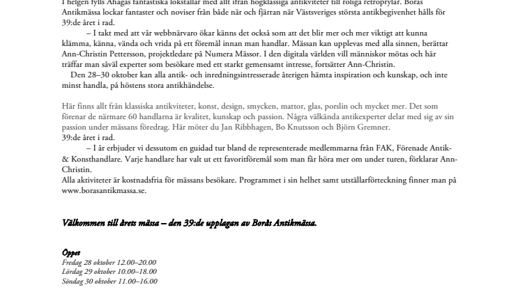 Borås Antikmässa: projektledare Ann-Christin Pettersson 0733-74 34 50 eller a.pettersson@numeramassor.com.