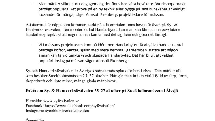 Sy-och Hantverksfestivalen är Sveriges största mötesplats för handarbete. Den märker alla som besöker Stockholmsmässan 25–27 oktober. Här går man in i en värld fylld av färg, form, skaparkraft och, inte minst, många glada människor.