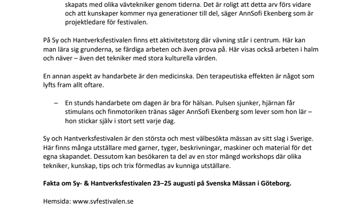 Sy och Hantverksfestivalen är den största och mest välbesökta mässan av sitt slag i Sverige. Här finns många utställare med garner, tyger, beskrivningar, maskiner och material för det egna skapandet. Dessutom kan besökaren ta del av en stor mängd workshops där olika tekniker, kunskap, tips och trix förmedlas av kunniga utställare.