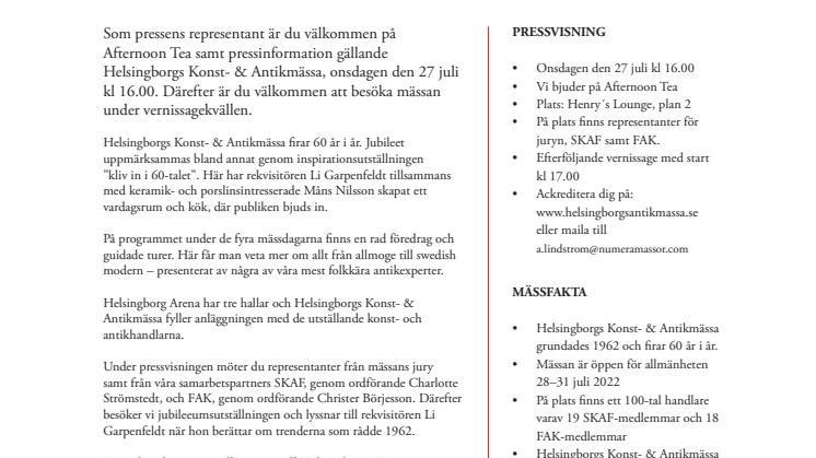 Som pressens representant är du välkommen på Afternoon Tea samt pressinformation gällande Helsingborgs Konst- & Antikmässa, onsdagen den 27 juli kl 16.00. Därefter är du välkommen att besöka mässan under vernissagekvällen.