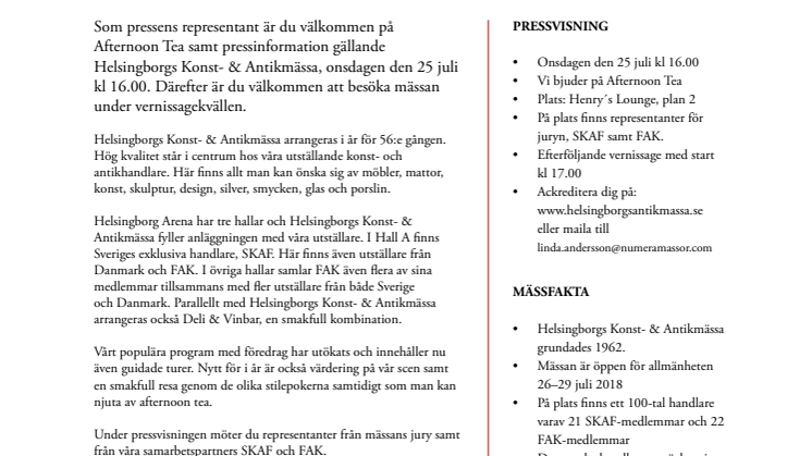 Som pressens representant är du välkommen på Afternoon Tea samt pressinformation gällande Helsingborgs Konst- & Antikmässa, onsdagen den 25 juli kl 16.00. Därefter är du välkommen att besöka mässan under vernissagekvällen.