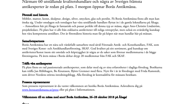 Som pressens representant är du varmt välkommen att besöka Borås Antikmässa. Ackreditera dig på www.borasantikmassa.se/press eller på plats i Informationen.
