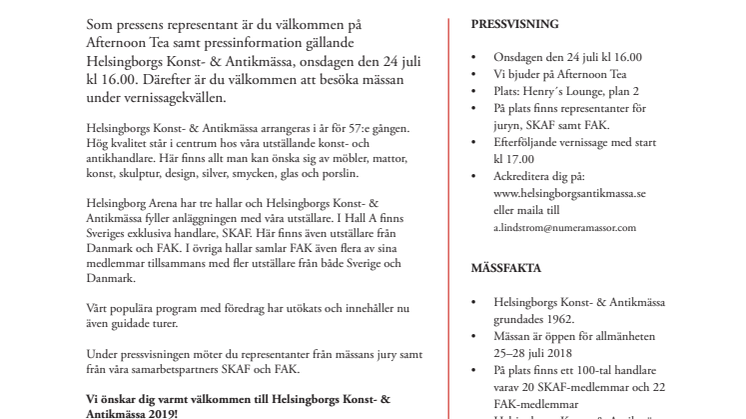 Som pressens representant är du välkommen på Afternoon Tea samt pressinformation gällande Helsingborgs Konst- & Antikmässa, onsdagen den 24 juli kl 16.00. Därefter är du välkommen att besöka mässan under vernissagekvällen.massa.se.