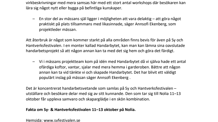 Fakta om Sy- & Hantverksfestivalen 11–13 oktober på Nolia.