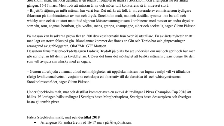 – Biljettförsäljningen inför mässan har varit bra. Det märks att folk är intresserade av en mässa som tydligare fokuserar på kombinationen av mat och dryck. Stockholm malt, mat och destillat rymmer inte bara öl och whisky utan också ett stort matutbud signerat Mässrestauranger som kombineras med massor av andra drycker som vin, rom, cognac, bourbon, gin, vodka, snaps, grappa, champagne, cider och cocktails, säger Glenn Pålsson.