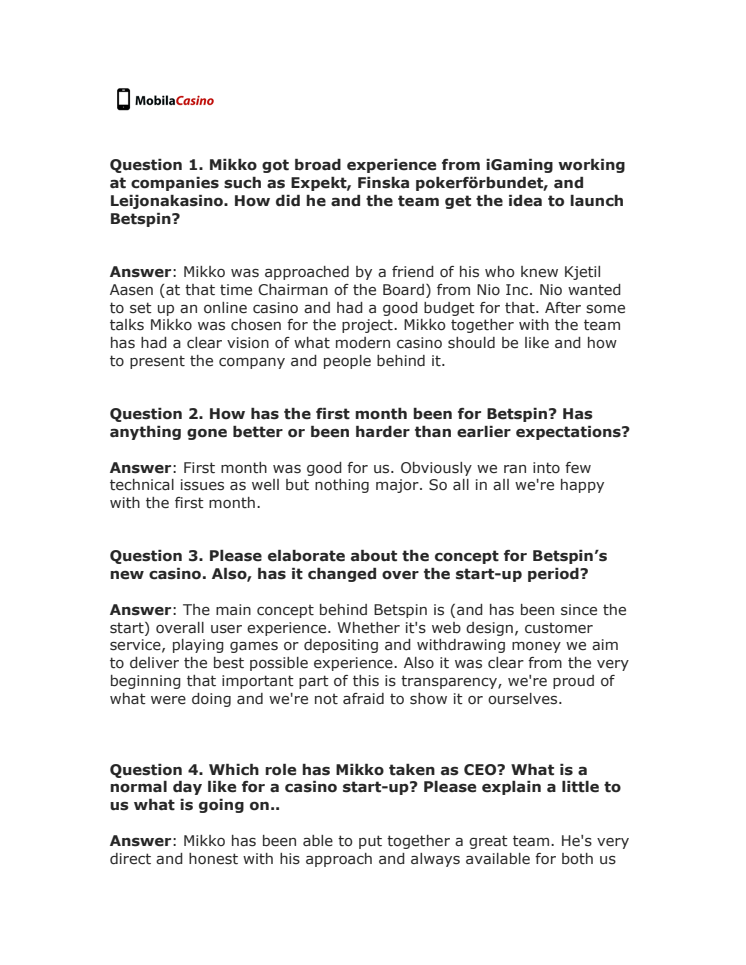 Mobila Casino gör en intervju med VD Mikko Hirvonen på landets nyaste mobilcasino, Betspin.