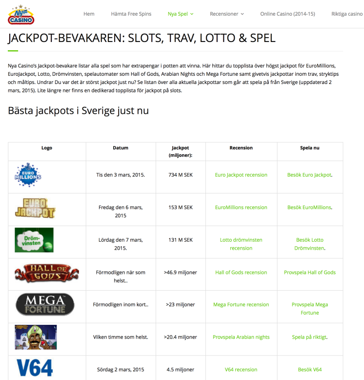 Det finns över 17 olika spel som har jackpot just nu. Med NyaCasino's jackpot-bevakare så kan du hålla koll på alla som finns tillgängligt för svenskar. Det nya verktyget bevakar Trav, Lotto, Stryktips, EuroMillions, EuroLotto, EuroJackpot, Drömvinsten, MegaFortune, Hall of Gods och många fler. Alla spel listas i rangordning utifrån hur hög jackpot som ges ut. Även datum och recension finns med.