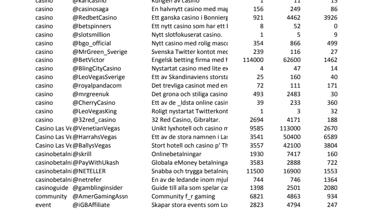 Nya Casino Limited har samlat in information om aktiva casinorelaterade bolag på Twitter. Det är tydligt att riktiga landbaserade casino har fler följare än casinon på nätet. Grosvenor casino i Storbritannien samt väletablerade Caesars Palace och Luxor i Las Vegas har alla över 150 000 följare på Twitter. Men även ett relativt nytt fysiskt casino som Resorts World Manila har över 68 000 följare. De enda onlinebaserade kontona som fungerar riktigt bra på Twitter är apptillverkaren @Zyngapoker med 258 000 följare och @BetVictor. En sektor som inte har många aktiva företag är casino-affiliate. Ett stort börsnoterat företag som Unibet (@Unibet_Affs) har inte bemödat sig att skapa en enda tweet än för sina casinoaffiliates.