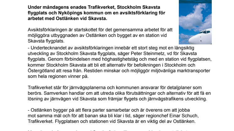 - Undertecknandet av avsiktsförklaringen innebär ett stort steg mot en långsiktig utveckling av Stockholm Skavsta flygplats, säger Peter Steinmetz, vd för Skavsta flygplats. Genom förbindelsen med höghastighetståg och med en station vid flygplatsen, kommer Stockholm Skavsta att bli ett alternativ för befolkningen i Stockholm och Östergötland att resa från. Restiden minskar och möjliggör miljövänliga marktransporter som hela regionen vinner på.