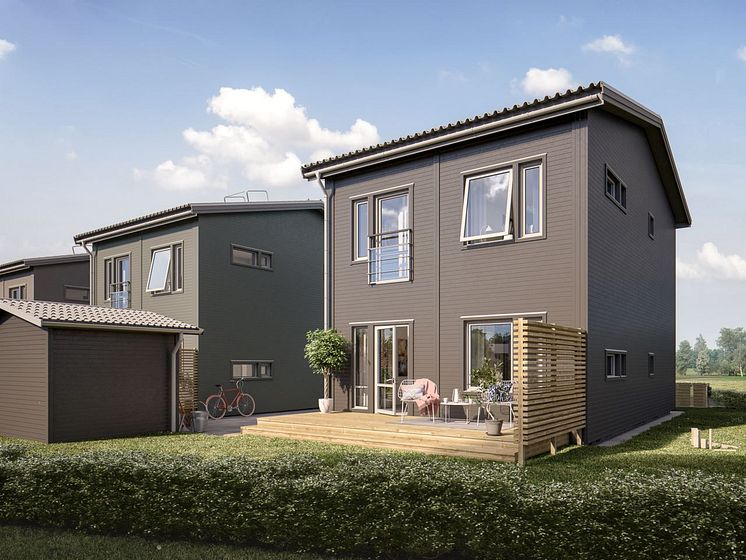 Brf Skriftställaren - 3D-bild av baksida friliggande hus