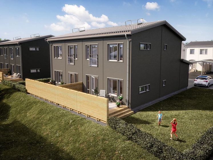 Brf Skriftställaren - 3D-bild av baksida radhus