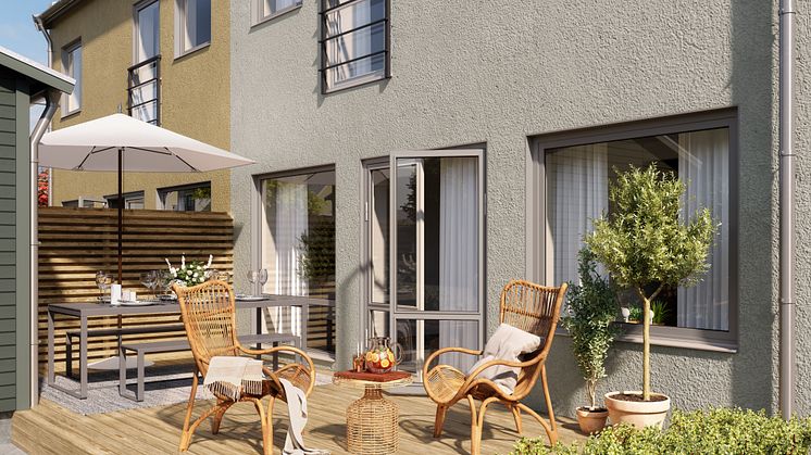 – Att husens entréer får kontakt med gatan bidrar till småskaligheten, liksom att häckar och grönska ramar in både hus och parkeringsplatser. Vi har också sett till att anpassa bostäderna efter väderstrecken för att få bästa möjliga läge på uteplatserna, säger Pernilla.
