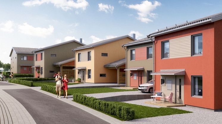 - Det är riktigt moderna hus i hela sin framtoning, säger projektutvecklare Emma Stålhammar. Fasaden är i puts och trä och färgsättningen har vi valt att göra ganska glad för att ge en levande och varm känsla till kvarteret.