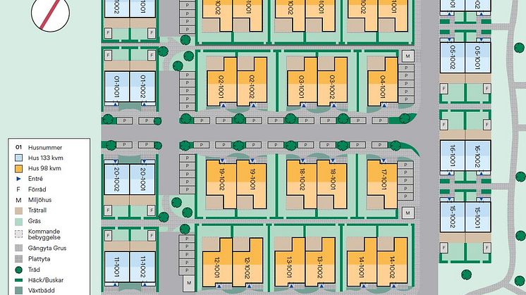 Bostäderna på 98 kvm har en ljus och öppen planlösning mellan kök, matplats och vardagsrum. Två toaletter, två sovrum – varav ett med klädkammare – och ett rymligt förråd angränsande till baksidans uteplats, ger mycket boende på en lite mindre yta.