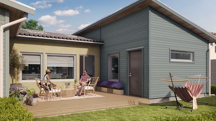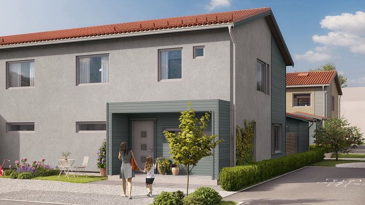 Husen i bostadsrättsföreningen får putsade fasader med inslag av träpanel, för att skapa en levande och variationsrik känsla i området.