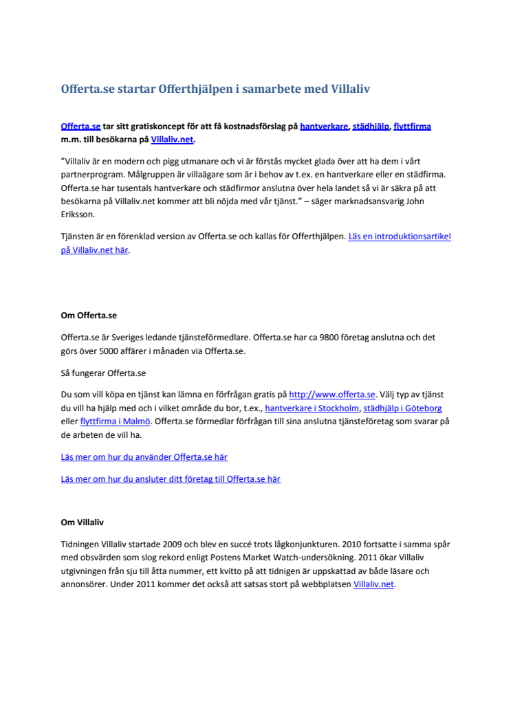 Offerta.se startar Offerthjälpen i samarbete med Villaliv