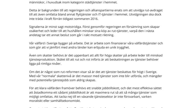 Detta är bakgrunden till att regeringen och allianspartierna enats om att utvidga rut-avdraget till att även omfatta bland annat flyttjänster och IT-tjänster i hemmet. Utvidgningen ska dock inte träda i kraft förrän tidigast sommaren 2016.