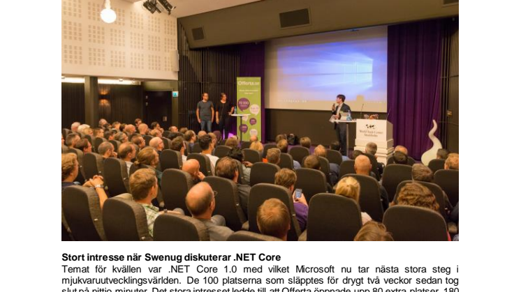 Temat för kvällen var .NET Core 1.0 med vilket Microsoft nu tar nästa stora steg i mjukvaruutvecklingsvärlden. De 100 platserna som släpptes för drygt två veckor sedan tog slut på nittio minuter. Det stora intresset ledde till att Offerta öppnade upp 80 extra platser.