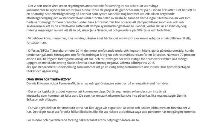 I Offertas/Företagarnas/SIFO:s Tjänstebarometer 2014, den mest omfattande undersökning som hittills gjorts på detta område, kunde tendenser gällande företagares oro för förändringar kring rut och rot märkas redan för ett år sedan. Närmare 70 procent av de 1 000 tillfrågade företagarna ansåg att rut- och rot-avdraget har varit viktiga för deras verksamhet, lika många uppgav att minskade avdrag skulle påverka deras företag negativt. Offerta påbörjar nu 2015 års Tjänstebarometerundersökning som kommer att ge en viktig temperaturmätare och inblick i hur tjänsteföretagen tänker och agerar idag.