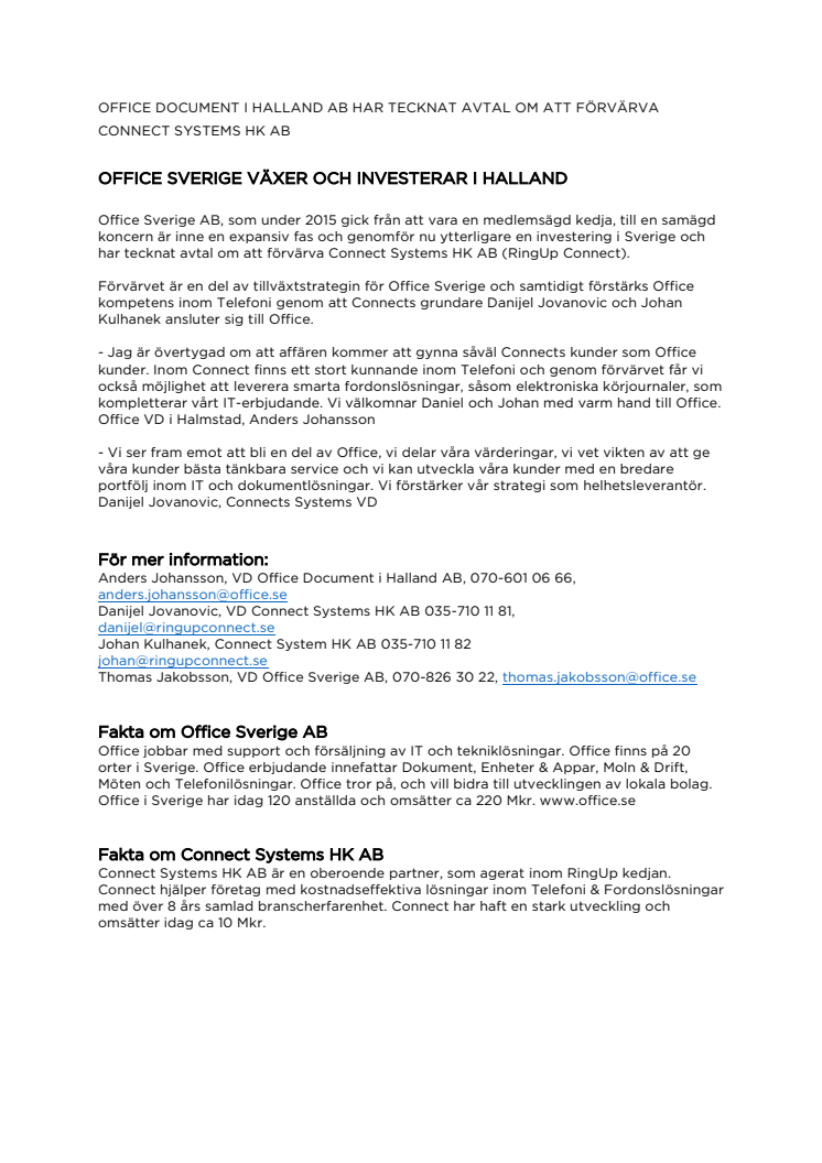 OFFICE DOCUMENT I HALLAND AB HAR TECKNAT AVTAL OM ATT FÖRVÄRVA CONNECT SYSTEMS HK AB