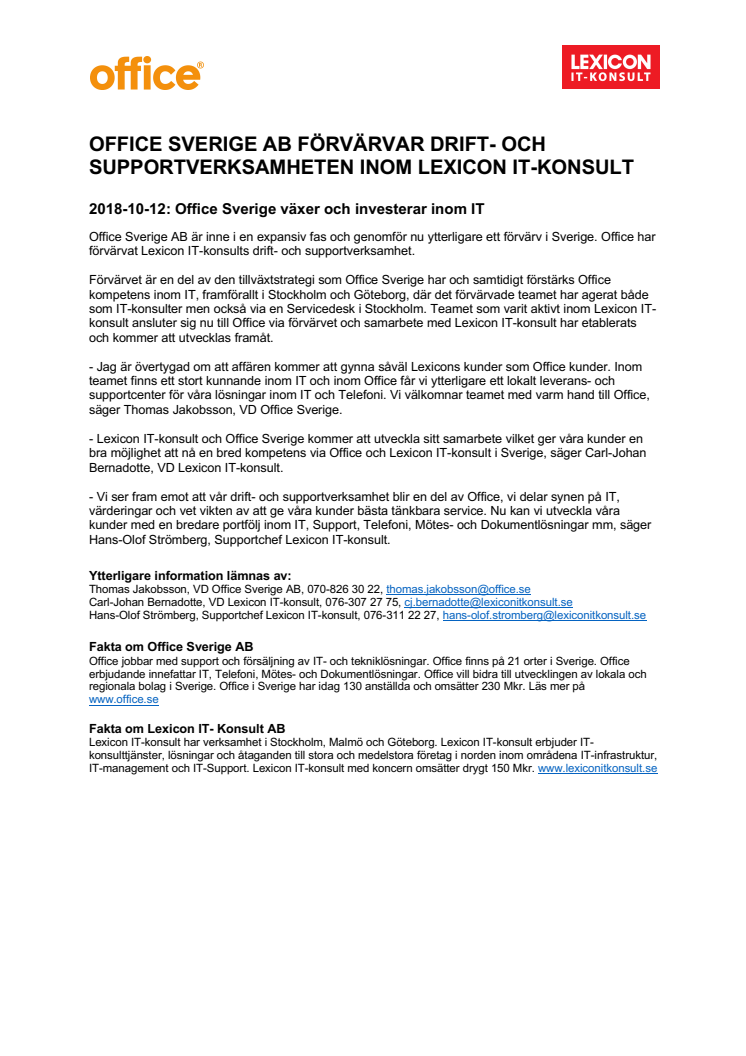 OFFICE SVERIGE AB FÖRVÄRVAR DRIFT- OCH SUPPORTVERKSAMHETEN INOM LEXICON IT-KONSULT