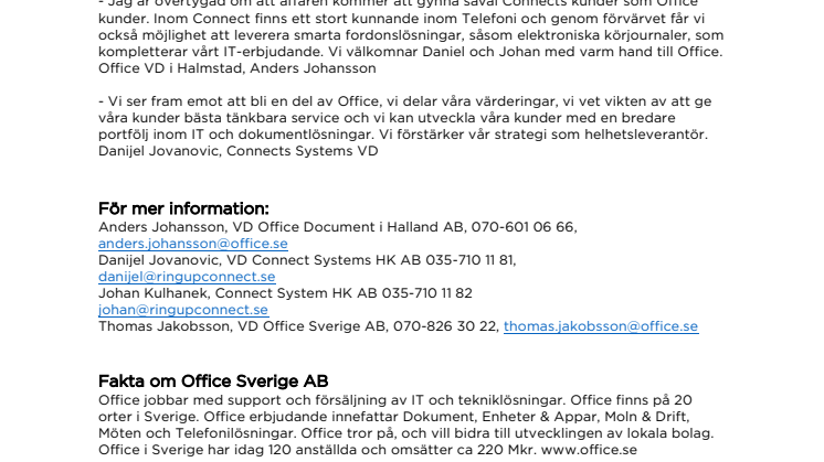 Förvärvet är en del av tillväxtstrategin för Office Sverige och samtidigt förstärks Office kompetens inom Telefoni genom att Connects grundare Danijel Jovanovic och Johan Kulhanek ansluter sig till Office.