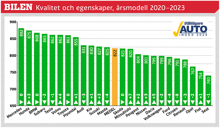 Svenska folket med privata bilar, årsmodellerna 2020–2023, har tyckt till om bilkvalitet och produktegenskaper. Betygen är omvandlade till indextal som teoretiskt kan variera från 0 till 1 000 poäng. Siffran i botten på staplarna visar skillnaden mot förra årets placering.