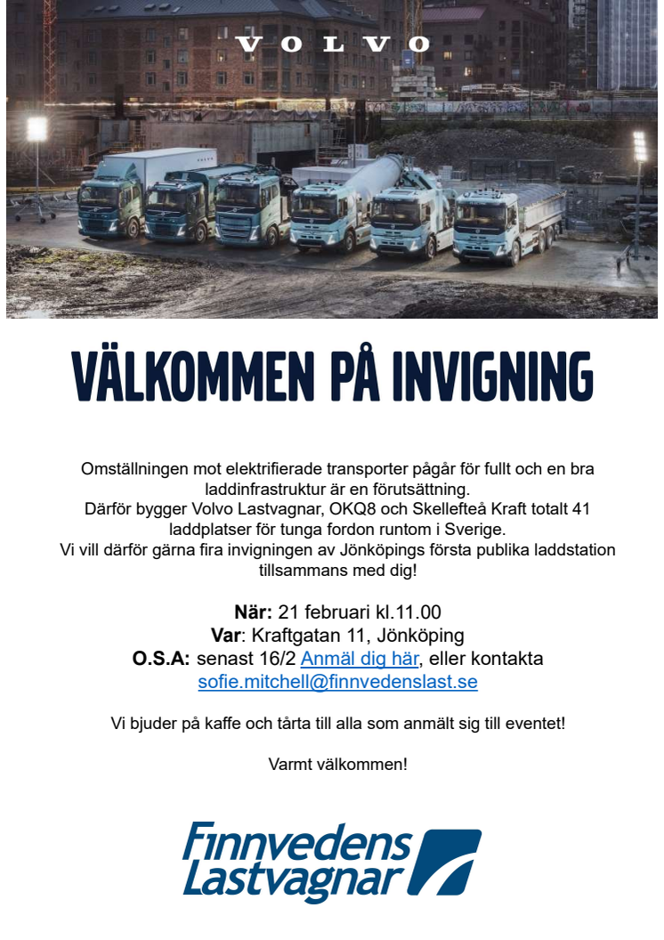 Omställningen mot elektrifierade transporter pågår för fullt och en bra laddinfrastruktur är en förutsättning. Därför bygger Volvo Lastvagnar, OKQ8 och Skellefteå Kraft totalt 41 laddplatser för tunga fordon runtom i Sverige.Vi vill därför gärna fira invigningen av Jönköpings första publika laddstation tillsammans med dig!
