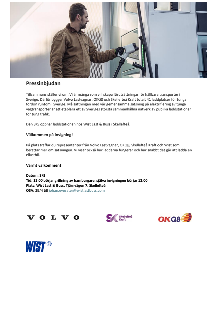 Volvo Lastvagnar, OKQ8 och Skellefteå Kraft bygger totalt 41 laddplatser för tunga fordon runtom i Sverige. Målsättningen med vår gemensamma satsning på elektrifiering av tunga vägtransporter är att etablera ett av Sveriges största sammanhållna nätverk av publika laddstationer för tung trafik. Den 3/5 öppnar laddstationen hos Wist Last & Buss i Skellefteå. Välkommen på invigning.