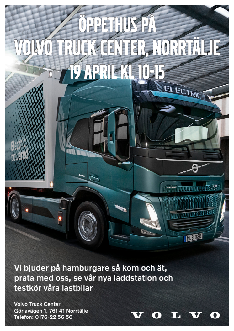Välkommen på Öppet hus hos Volvo Truck Center i Norrtälje den 19 april kl 10:00-15:00. Här visar Volvo Truckcenter upp OKQ8:s, Skellefleå Kraft och Volvo Lastvagnars nya laddstation för tung trafik. Laddstationen har två laddare med en kontinuerlig effekt på 350kW och en ny sorts betalningsterminal som möjliggör att fler lastbilar kan ladda samtidigt.