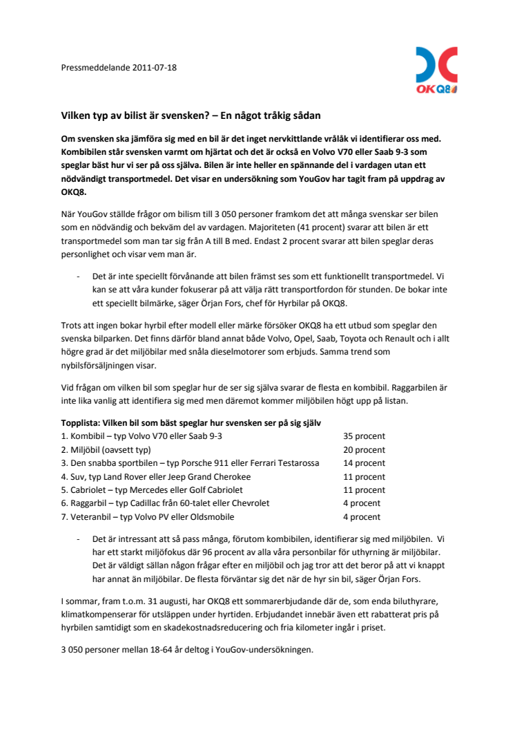 Om svensken ska jämföra sig med en bil är det inget nervkittlande vrålåk vi identifierar oss med. Kombibilen står svensken varmt om hjärtat och det är också en Volvo V70 eller Saab 9-3 som speglar bäst hur vi ser på oss själva. Bilen är inte heller en spännande del i vardagen utan ett nödvändigt transportmedel. Det visar en undersökning som YouGov har tagit fram på uppdrag av OKQ8.